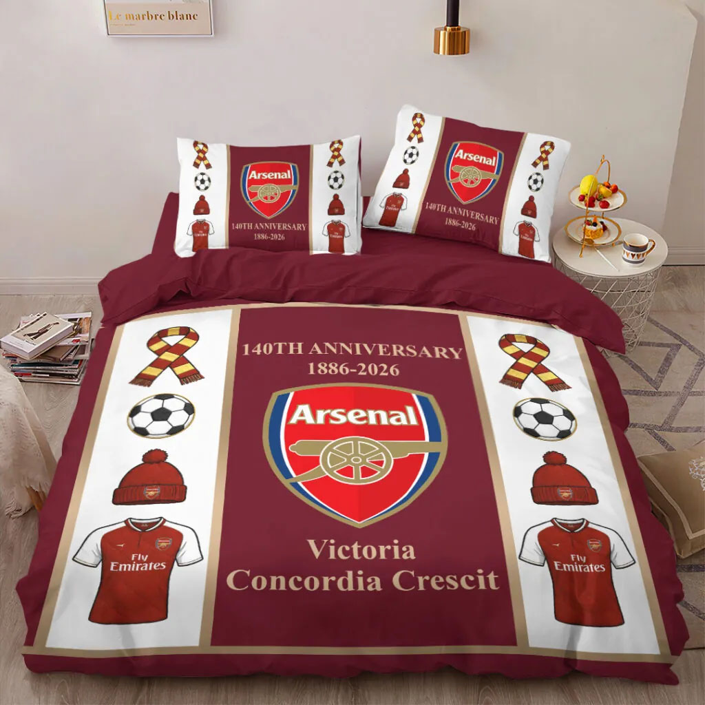 Celebrate club pride with the Arsenal FC 140th Anniversary Personalized Bedding Set (4 pcs). Featuring iconic red and white club-inspired graphics, this set includes a custom duvet cover, bed sheet, and pillow shams made from soft, durable polyester with vibrant, fade-resistant printing.