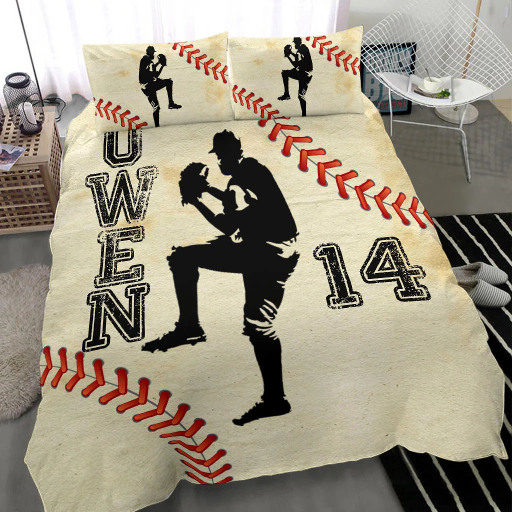 Baseball Boy Pitcher Beige Player custom bedding set – Personalized duvet cover, bed sheets, pillow shams